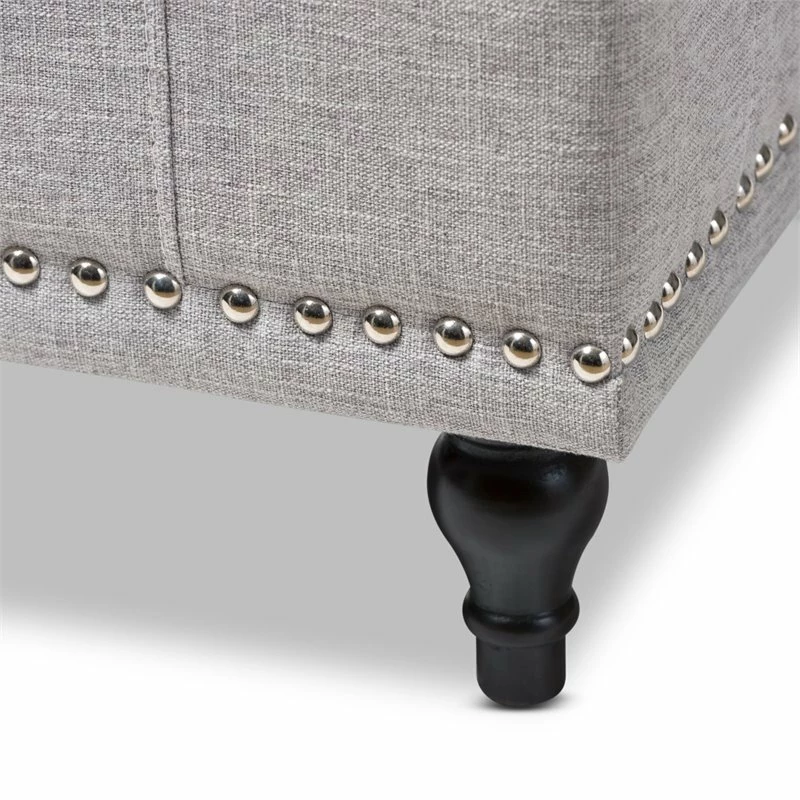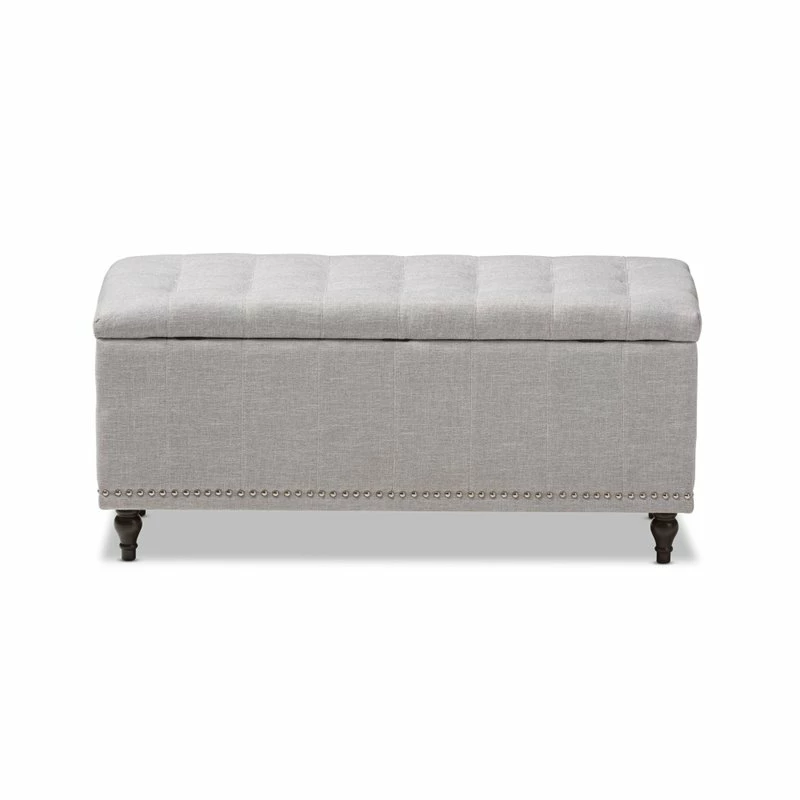Whether paired with upholstered bed as a bed end bench or simply on its own, this modern classic button-upholstered storage ottoman offers classic and smart interiors styling with practical internal storage that will work in any room. Add an on-trend neutral accent to a simple white room, the Kaylee storage ottoman bench is upholstered in polyester fabric available in your choice of beige, grayish beige, dark gray or light blue color for a neutral or statement look. Constructed of solid rubberwood frame and feet, the Kaylee is built to last. The ottoman box opens up to reveal internal storage for blankets and bed linen. Softly padded, the top of the lid features button-tufting with grid lines while the sides are trim with silver nail heads for a modern look. For refined elegance, the detailed stitching on all sides and the classic feet complete the look. Made in Malaysia, the Kaylee storage ottoman bench requires minor legs assembly