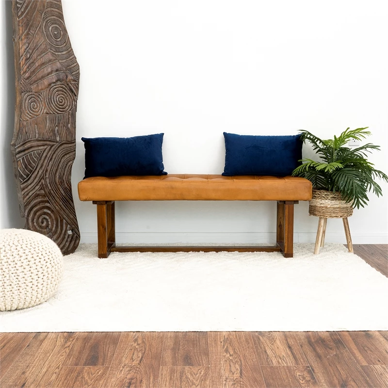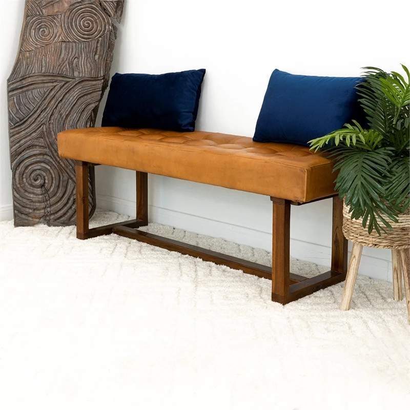 This modern style Dallas Tan Brown Leather Bench completes the living room, dining room, and bedroom. Timeless in style, this bench makes for a stylish addition with teak frame and tan brown color genuine leather. Contemporary design, this elegant ottoman offers a modern aesthetic. It’s ample size and foam filled cushioned top allow it to function as a spare seat when you’re entertaining. Flaunting rich brown finishing, this stool will definitely bring an earthy tone to any room or space. Get this elegant piece today at a price that won’t hurt your pocket! Due to leather’s natural characteristic, texture and color may vary.