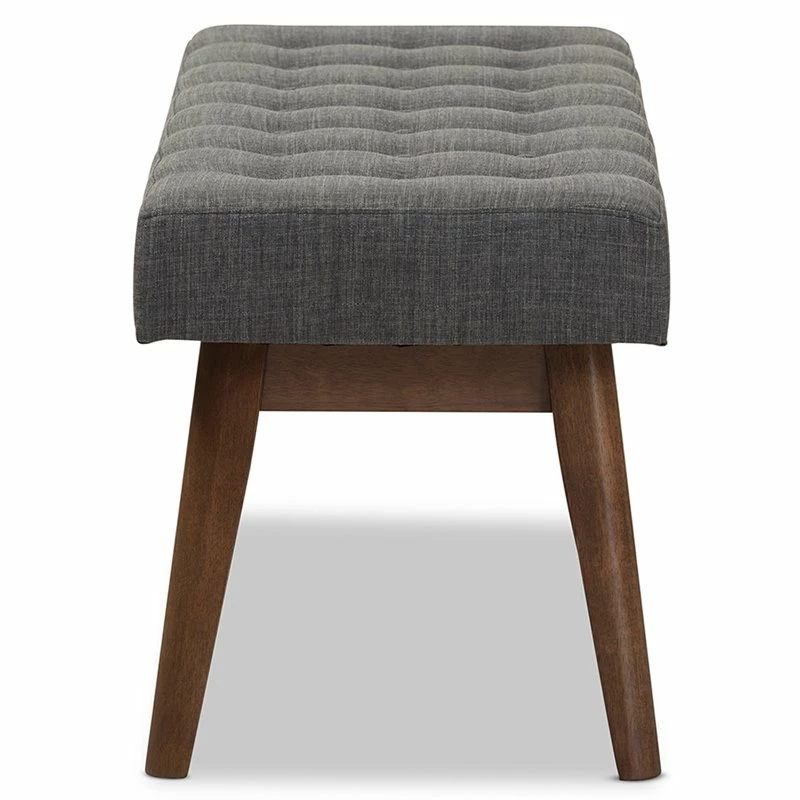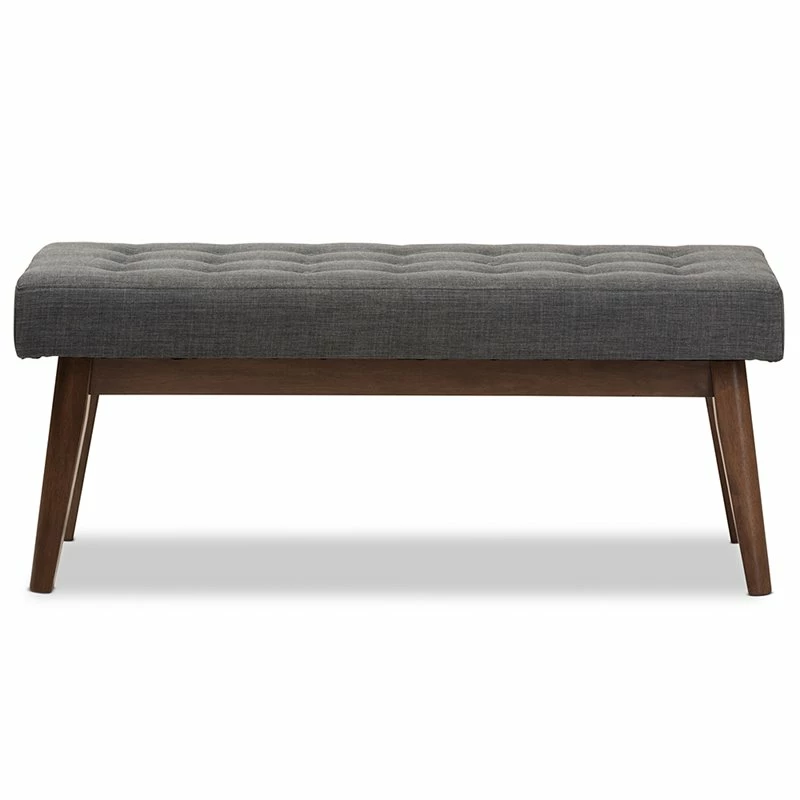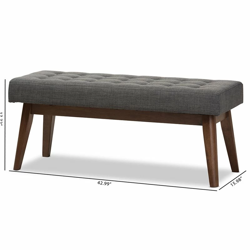 Channel classic good looks in your aesthetic with the handsome walnut wood and fabric of the Elia button-tufted bench. Constructed of solid rubber wood frame, this padded bench is upholstered in dark Gray polyester fabric for a resilient surface with luxurious comfort and lasting good looks. Design is ideal for your living area or entrance as well as waiting rooms and offices. Dark walnut tone on the frame complements the cool light Gray upholstery for a demure, mid-century modern-inspired palette in your space. Button-tufting design instils an on-trend sought after look in your living space. Made in Malaysia, the Elia requires assembly.