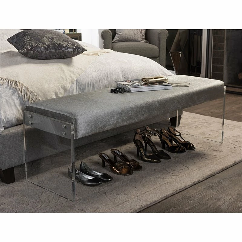 Featuring minimalism, the Hildon upholstered seating bench will add contemporary flair to your dramatic home accent. Upholstered in grey microsuede, which is a 100% polyester fabric, the seating bench features transparent acrylic paneled legs on two sides to support the bench. The bench is evenly padded with foam, providing a smooth and soft seating surface. Display it at the foot of your bed or use it as extra seating in your living room, the Hildon will sure to win the wows from your guests. The Hildon is ideal for both residential, lounge seating as well as store display. Each seating bench accepts a weight capacity of over 400 lbs. and can sit up to two adults comfortably. Made in China, the bench requires assembly.