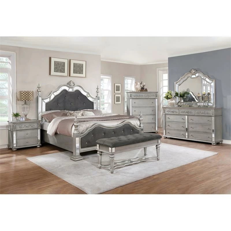 Bedside bench with gray velvet tufted seats and metallic gray base. The bench’s base features mirrored panels on the corners and is also available in black velvet instead of gray. This bench is sold separately but can be purchased as part of a matching bedroom set series that include a bed, dresser, dresser with mirror attached, nightstand, and chest. Minimal assembly required.