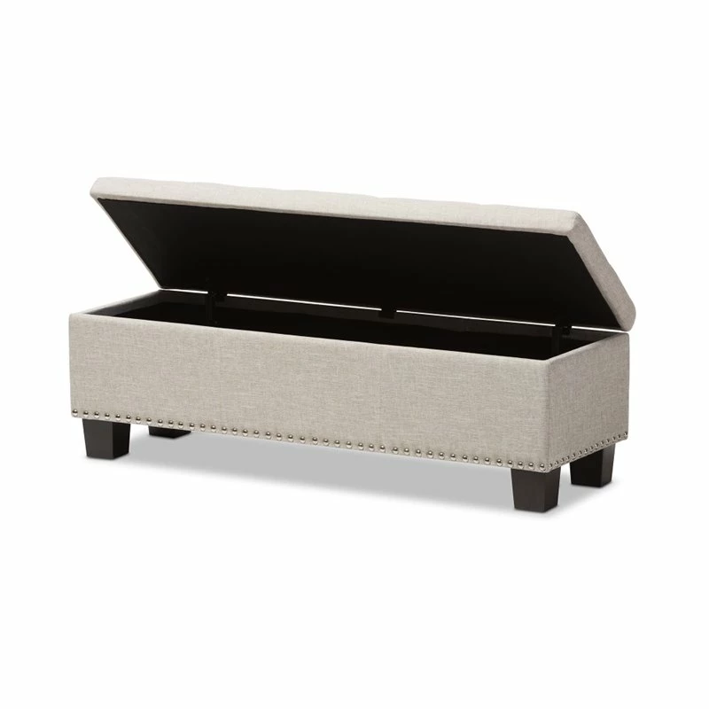 For hidden storage that doubles as additional seating, opt for the modern and contemporary style and comfortable finish of the storage ottoman bench. Constructed of eco-friendly solid rubberwood frame for sturdiness and durability, the storage ottoman bench is upholstered in soft polyester blend fabric available in your choice of beige, grayish beige, dark gray or light blue color for a neutral or statement look. The hinged lid includes a cushioned finish for plush comfort, making storage box suitable as extra seating. Beautifully finished with silver nail heads trim, the storage bench features diamond-shaped button-tufting design with deep storage space for added functionality. A versatile piece perfect for storing linens or cushions, the bench creates a spot of contemporary style with the benefit of hidden storage. To complete the look, the storage trunk is sitting on four solid rubberwood chunky feet for a strong foundation.