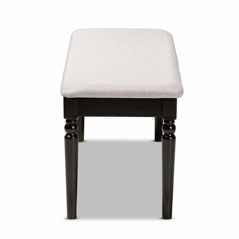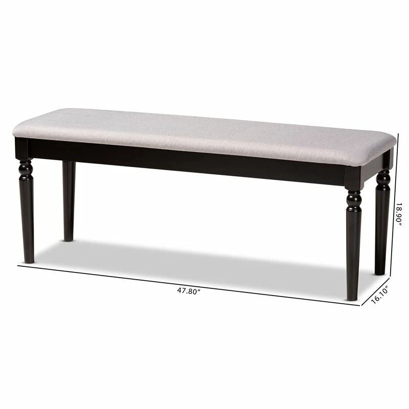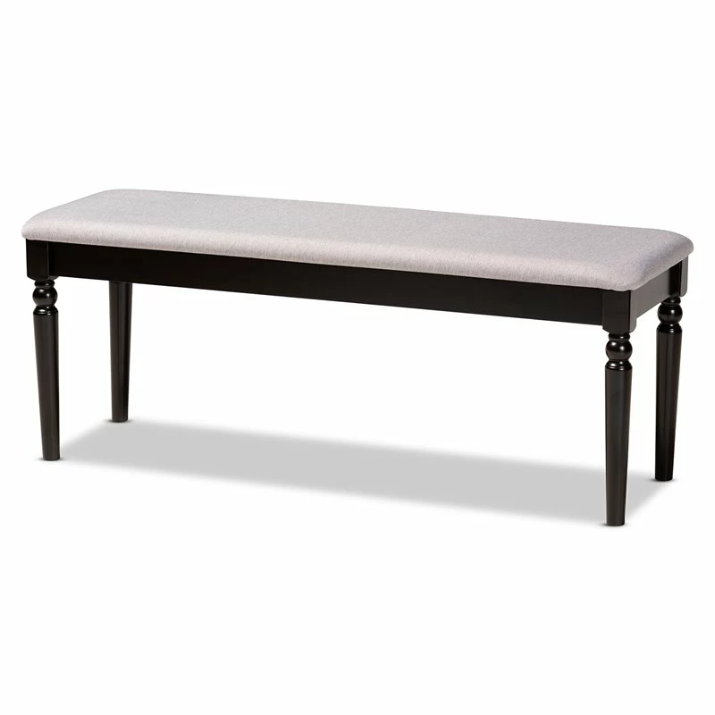 Enhance your dining space with the graceful comfort of the Bowery Hill dining bench. Made in Malaysia, the bench is comprised of sturdy wood finished in a rich dark brown. Equipped with a large foam-padded cushion upholstered in soft fabric, the bench provides exceptional seating comfort. Requiring assembly, the bench features ball turned legs for a classic look. The elegant and versatile dining bench works well with a dining set or as an accent piece in the entryway.