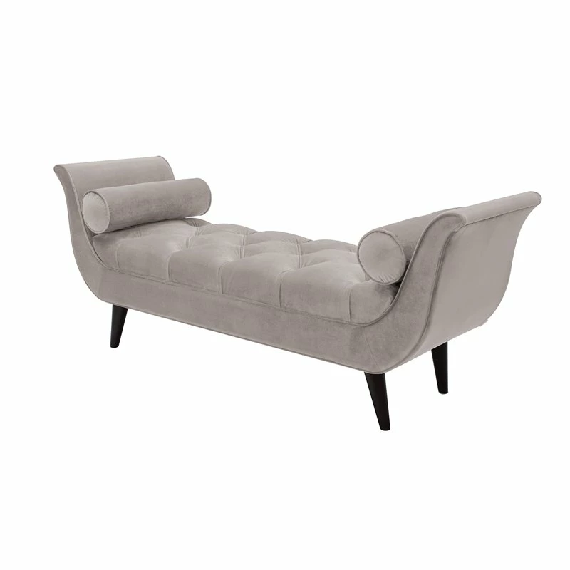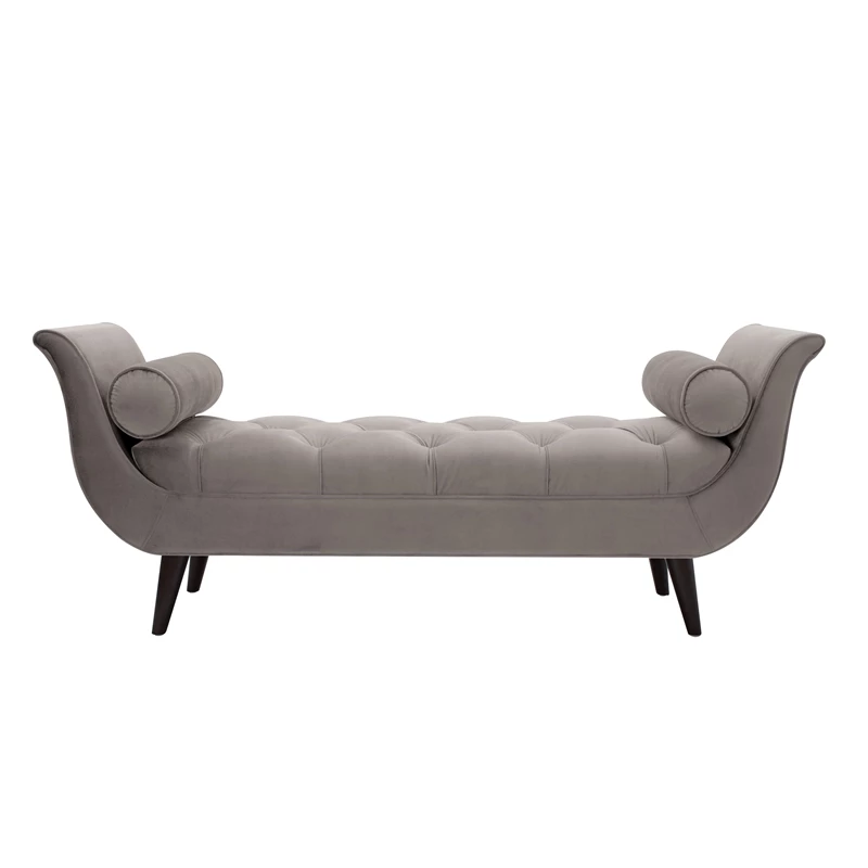 The entryway bench is the perfect addition to any living space looking to add a bit of a modern flair. The bench is upholstered with high-quality fabric and the solid wood frame is made from kiln-dried birch which provides exceptional support and stability. Beautifully handmade with dramatic flared arms, hand tufted buttons on the seating surface, and 2 matching bolster pillows. Whether it’s used as additional seating for guests, or just to spruce up your home decor, this bench brings class and lounging comfort to any room in the home.