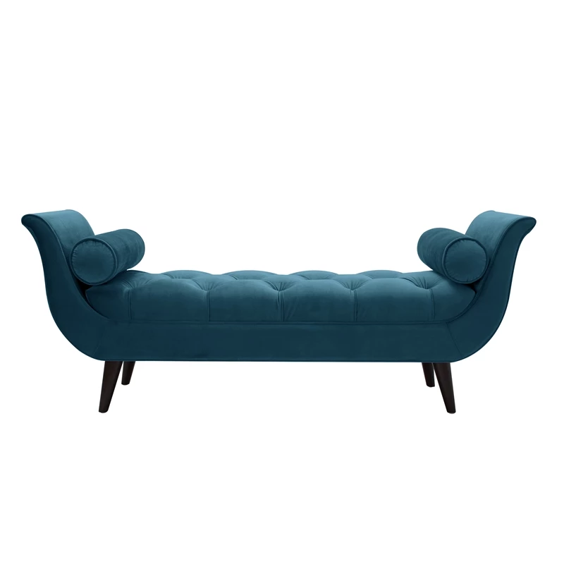 The entryway bench is the perfect addition to any living space looking to add a bit of a modern flair. The bench is upholstered with high-quality fabric and the solid wood frame is made from kiln-dried birch which provides exceptional support and stability. Beautifully handmade with dramatic flared arms, hand tufted buttons on the seating surface, and 2 matching bolster pillows. Whether it’s used as additional seating for guests, or just to spruce up your home decor, this bench brings class and lounging comfort to any room in the home.