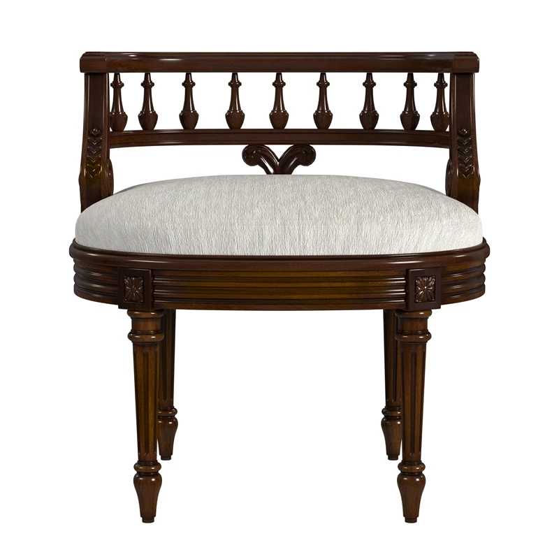 This elegant hand painted vanity seat adds formal elegance to any powder or dressing room. Hand crafted from poplar hardWood solids and Wood products, it features a carved solid Wood back and legs. The generously-sized, upholstered seat cushion is covered in an ivory cotton hobnail fabric.