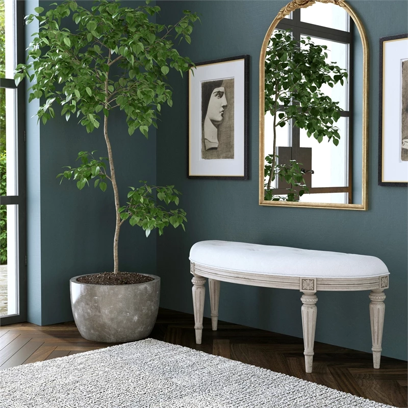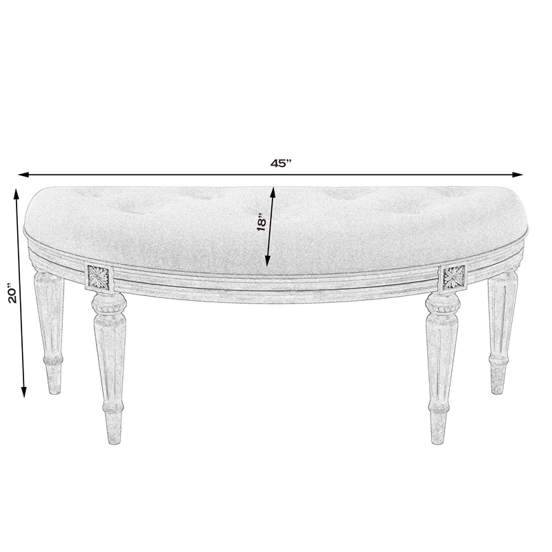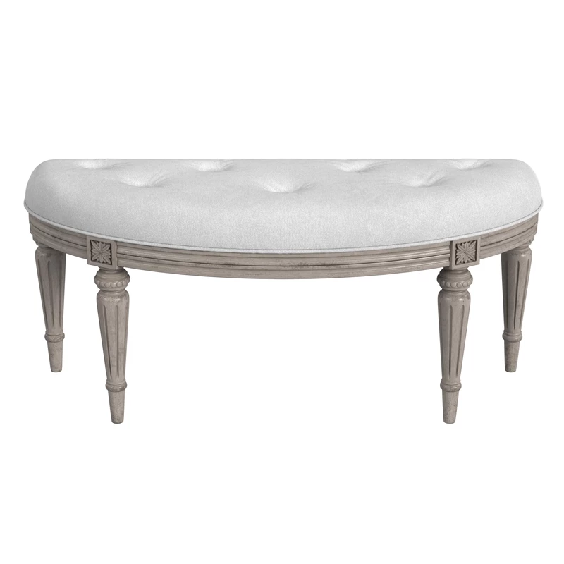 This elegant Demilune bench features an ivory tufted-button upholstered cotton seat atop carved solid hardwood Driftwood finished legs. It will stunningly dress up your dressing room, foyer or hall.