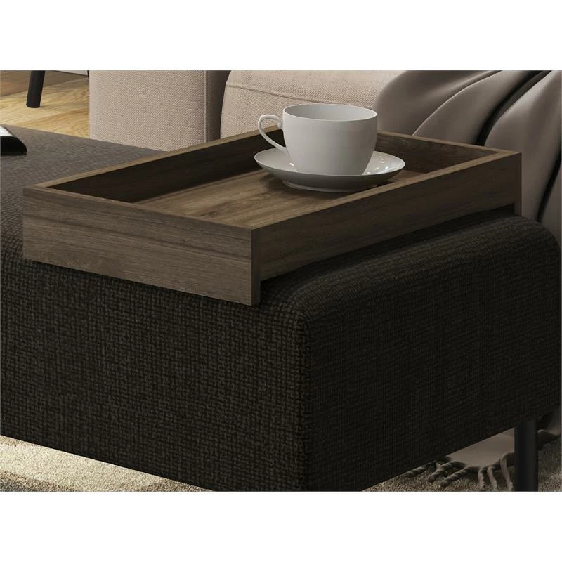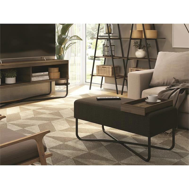 The Ace bench part of our KD collection in dark brown fabric with black painted base with dark oak tray features clean, modern lines adding a sophisticated look and edge to any room. Our Ace bench is constructed using top materials, engineered wood with exceptional quality that are made to last. NOTE: This item is Knock down (KD) also known as Ready-to-assemble furniture (RTA) that requires full at-home assembly.
