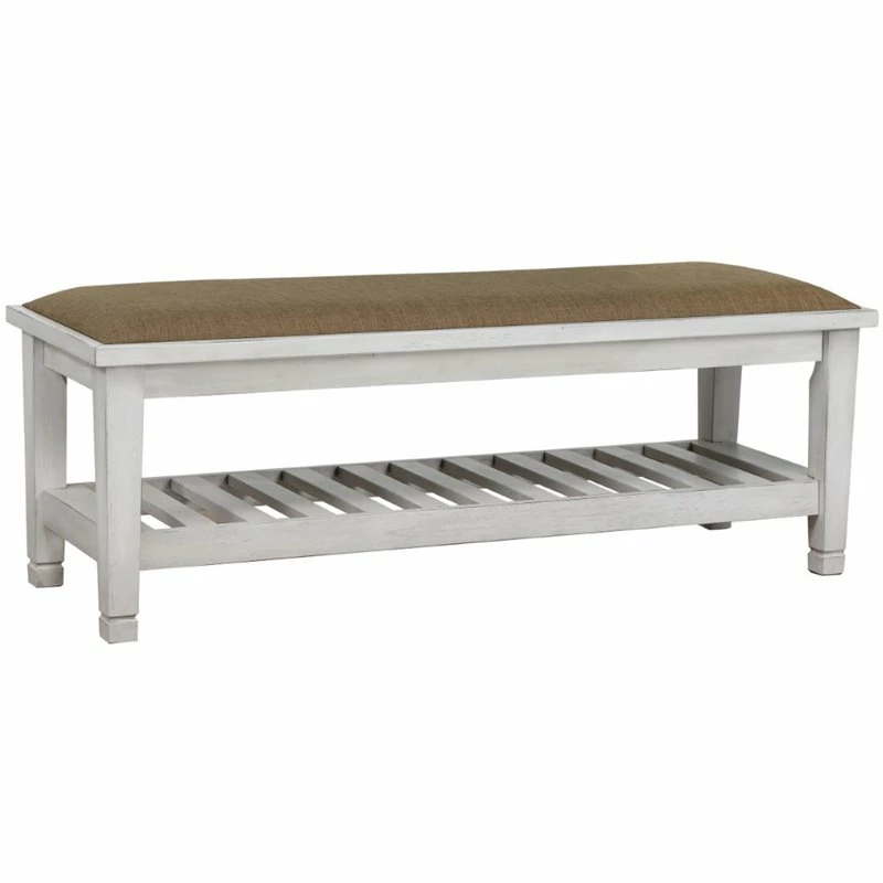 With a cool, transitional design, this bench is a stylish enhancement to any living space. Elegant beveled edges blend appealingly with subtle, tapered legs. A versatile lower storage shelf boasts a classic, slatted wood design. An antique white finish completes its glamorous look. With a soft, cozy seat cushion, this bench is a classy and comfortable choice.