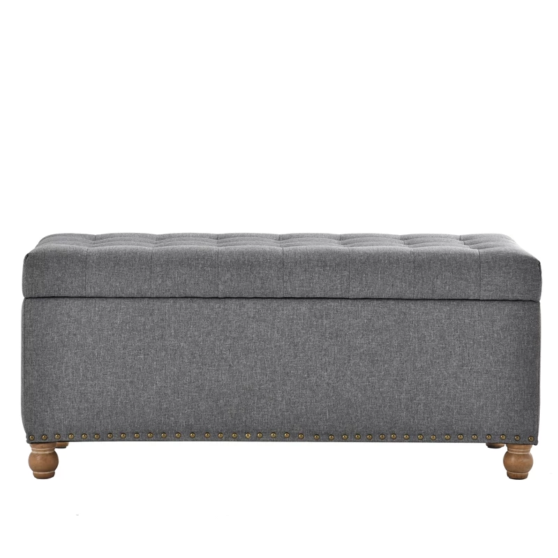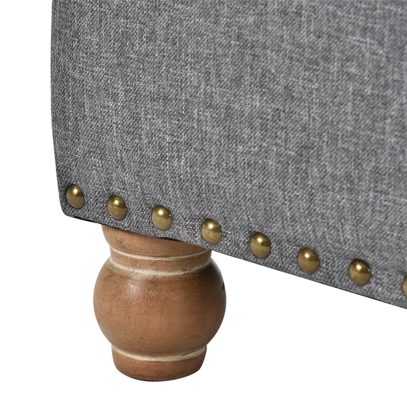 More than just a spare seat or stylish accent, this bench brings a convenient storage solution to the space that needs it most. Perched atop four feet with turned detailing, this piece is crafted from solid Eucalyptus frame and rubber wood legs. Upholstered in polyester, it showcases brozen nailhead detailing, exuding subtle sophistication in your space.