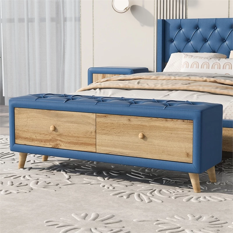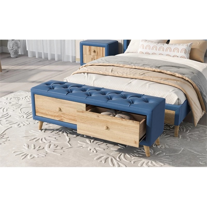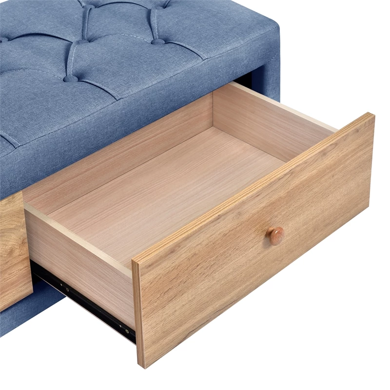 Discount π€© CRO Decor Upholstered Storage Ottoman Bench 2 Drawers With Rubber Wood Leg-Blue π