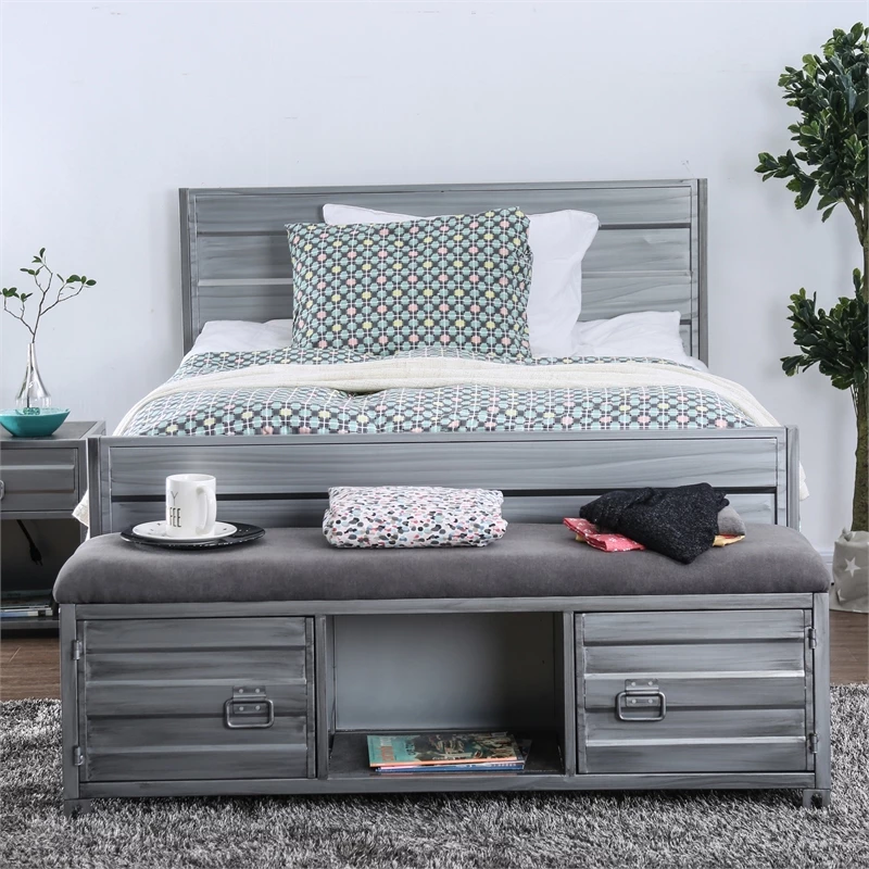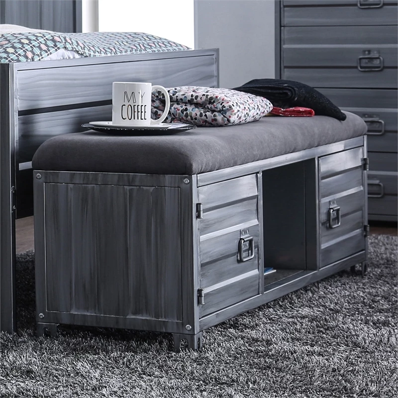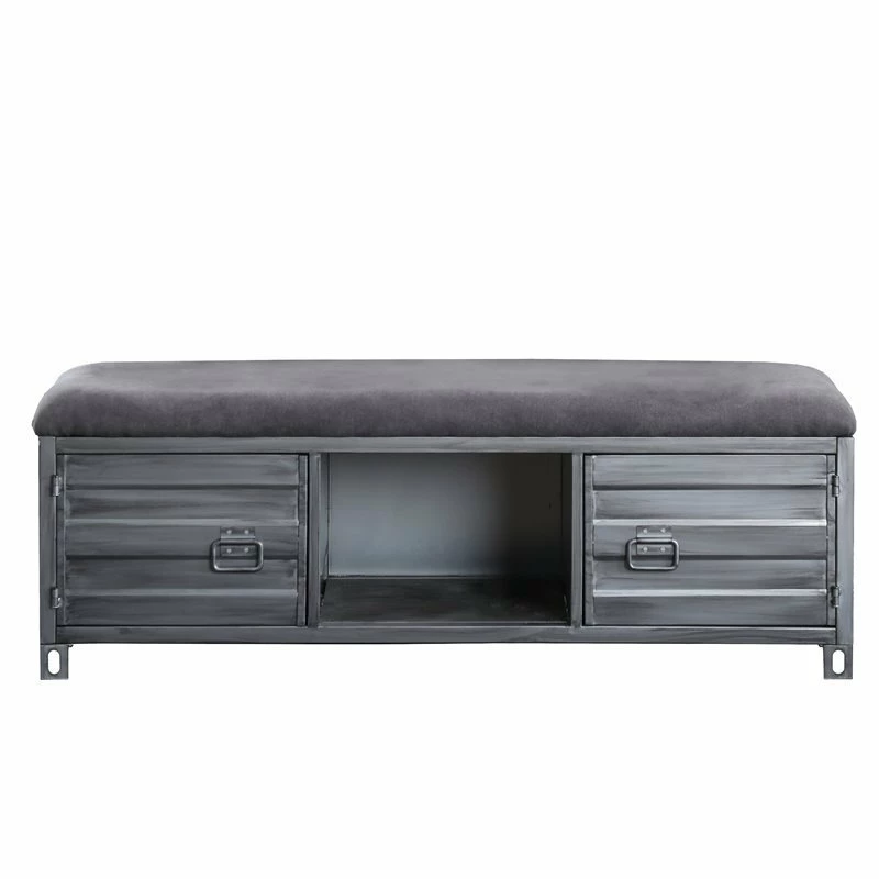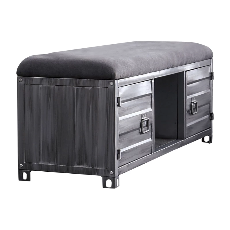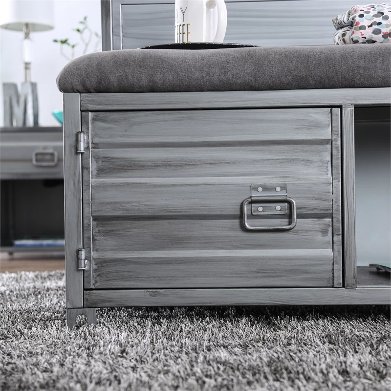 Bring a part of the cool Furniture of America Hazier collection into your living room for an industrial aesthetic that is tied together with the metal construction and industrial details. This hand-brushed silver storage bench offers two side cabinets and a center open shelf for ample storage space. For added comfort, the seat of the bench is upholstered with fabric and padded with soft foam.