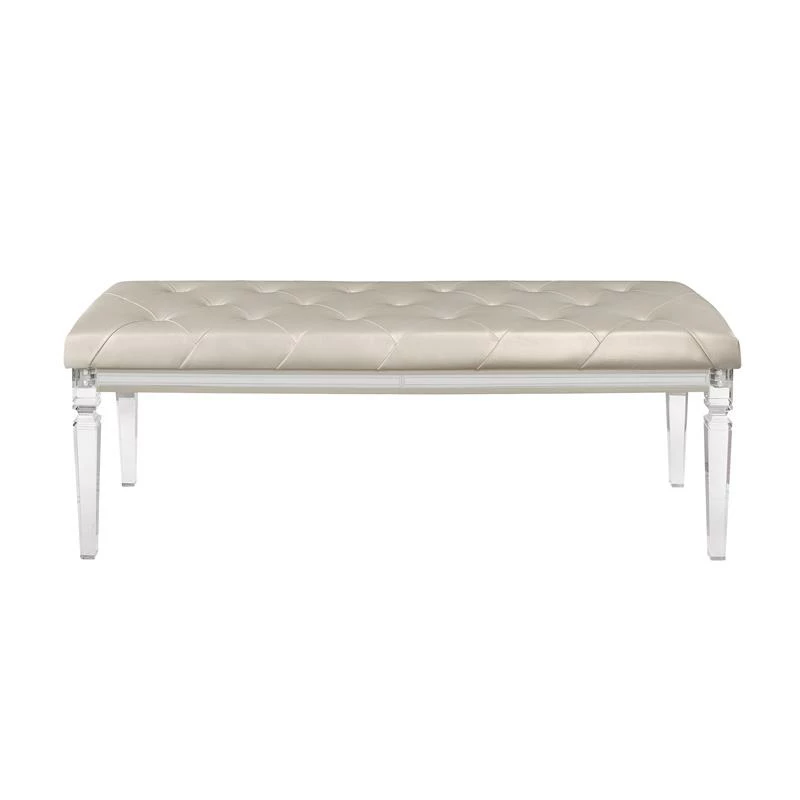 Presenting the Paris from Global Furniture, an elegant, eye-catching transitional style bench. This bench highlights the notion that exquisite look and a graceful yet functional piece. From the gorgeous champagne toned upholstered seating, to the lovely mirror accents, this bench will add elegant notes to your room setting without sacrificing function. Tapered acrylic legs and tasteful design accents add additional graceful appeal make this piece supremely practical and an efficient way to keep your room stylish for the ages. Quality craftsmanship in every facet of production, ensures durability and long-lasting wear. The Paris is the perfect way to make your bedroom comfortable and inviting, this bench is an absolute winner in versatile and stylish room furnishings.