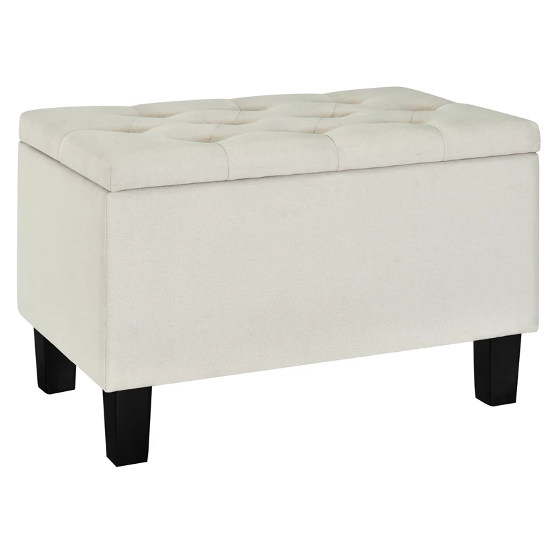Versatile and fuctional, this storage bench offers an understated traditional elegence to any space in your home. With a padded, tufted seat and hinged lid revealing ample storage space, this bench works great at the end of the bed or anywhere that extra seating and/or storage is needed. Upholstered in clean, soft fabric in neutral tones, this is the ideal piece for many different home décor styles. Constructed with quality materials, supported with square tapered wood legs, and air holes in the bottom of the bench ensure air flow even if the lid is shut, this storage bench is one you’ll want in every room.