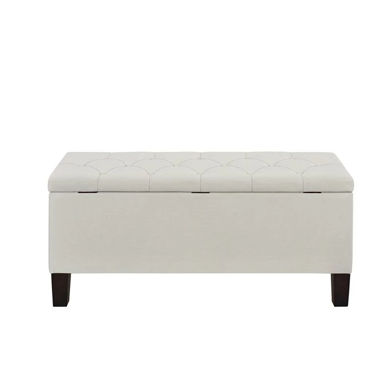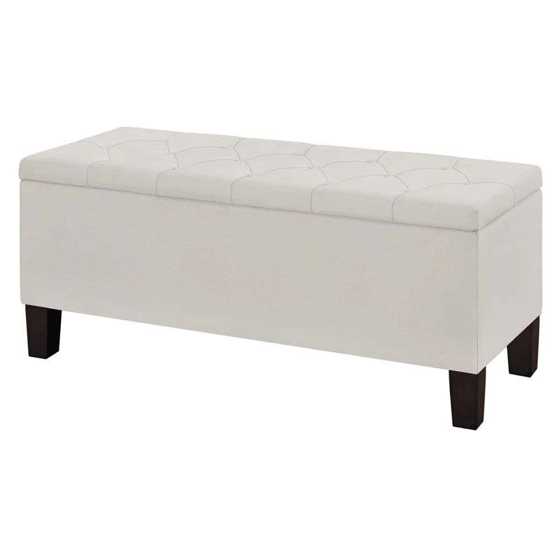 Versatile and fuctional, this storage bench offers an understated traditional elegence to any space in your home. With a padded, tufted seat and hinged lid revealing ample storage space, this bench works great at the end of the bed or anywhere that extra seating and/or storage is needed. Upholstered in clean, soft fabric in neutral tones, this is the ideal piece for many different home décor styles. Constructed with quality materials, supported with square tapered wood legs, and air holes in the bottom of the bench ensure air flow even if the lid is shut, this storage bench is one you’ll want in every room.