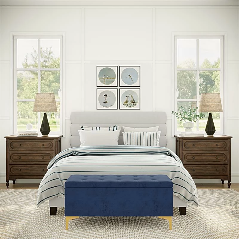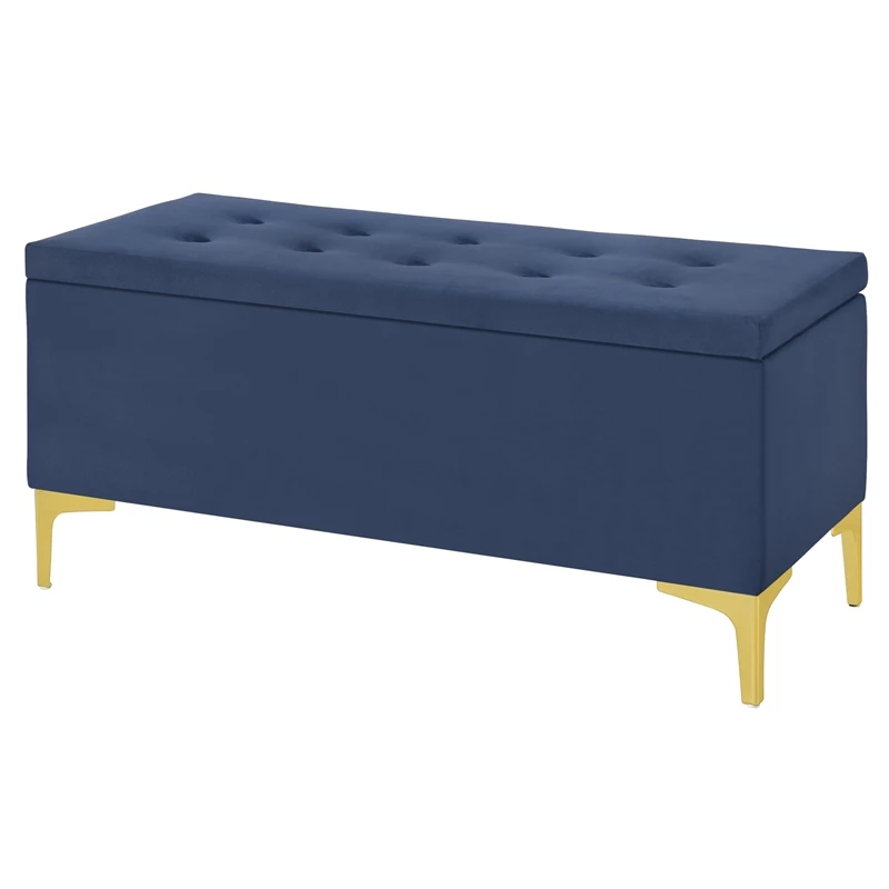 Versatile and fuctional, this storage bench’s smooth low-pile velvet fabric and gold metal bracket legs lend a sophisticated modern vibe to any space. With a padded seat and hinged lid revealing ample storage space, this bench works great at the end of the bed or anywhere that extra seating and/or storage is needed. Upholstered in clean, soft fabric in neutral tones, this is the ideal piece for many different home décor styles. Constructed with quality materials, generously padded for comfort and air holes in the bottom of the bench ensure air flow even if the lid is shut, this storage bench is one you’ll want in every room.
