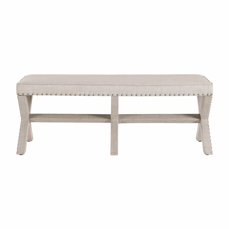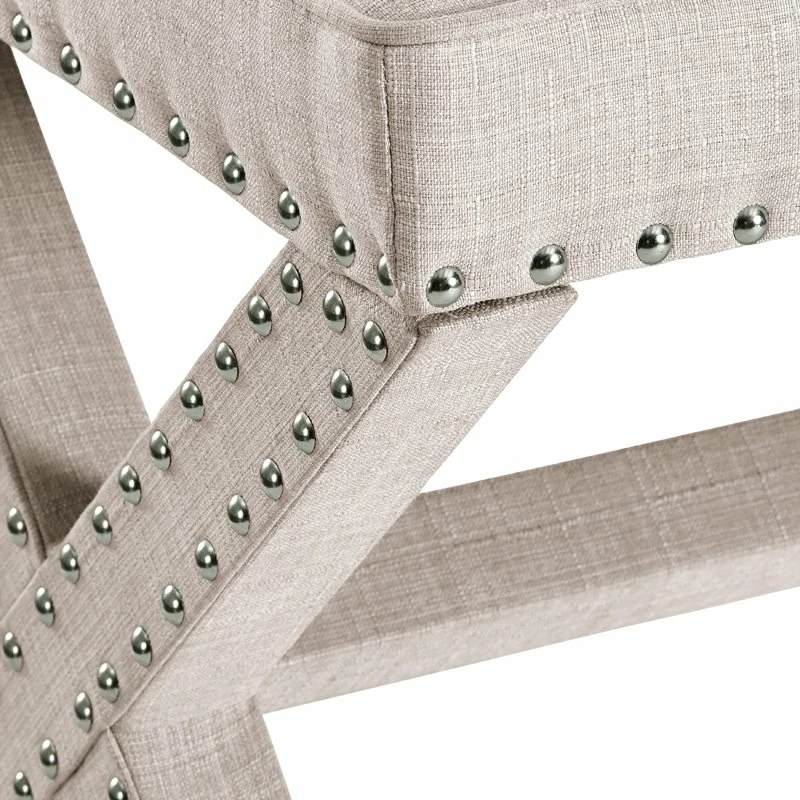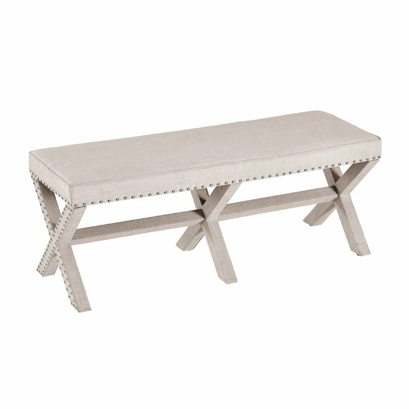 With style and functionality, the Beige Upholstered ‘X’ Base Bed Bench offers a durable, linen-like fabric cover in a neutral beige colorway. The plush foam padded top provides comfortable seating. Full of sophisticated style, this bench pairs decorative brushed nickel nail head trim and a unique ‘X’ style base with stretcher. Its smooth, padded top makes this bench an ideal place to display a tray or sit to put on shoes before heading out the door. With unmatched design, the Beige Upholstered ‘X’ Base Bed Bench would be a nice addition to any room in your home.Durable, linen-like fabric cover in a neutral beige colorway.Unique ‘X’ style base with stretcher.Plush foam padding for comfort .Brushed nickel nail head accenting on seat and ‘X’ base
