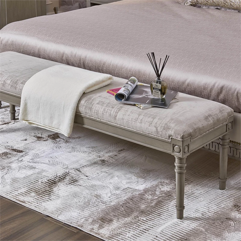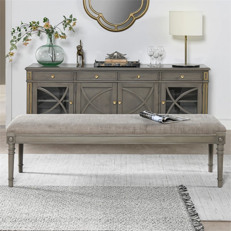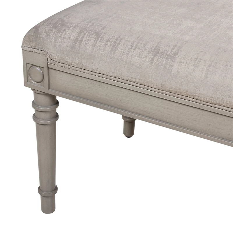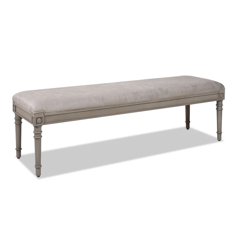 Add class and refinement to any room in your home with the Dauphin 60” Upholstered Bench by JTH Luxe. Crafted from solid Russian Birch Wood and upholstered in a beautifully antiqued chenille fabric, the Dauphin Bench is the perfect complement to any entryway, dining seating set, or foot of the bed. Artisan wood carved details accent this simple silhouette. See the Dauphin Collection for the matching dining table and chairs, entryway storage console, and more.