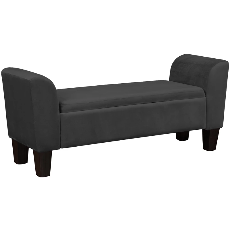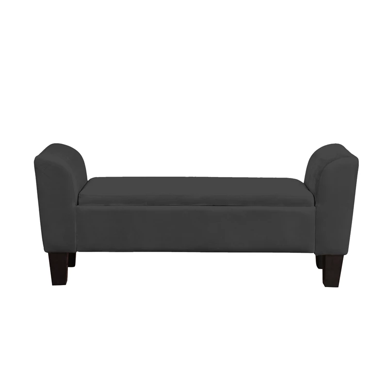 Glam up your home with the contemporary Mila beautiful velvet storage bench! The chic design of the curved arms, solid wood tapered black legs, performance velvet fabric, and plenty of storage space will add a striking visual appeal in any room setting.