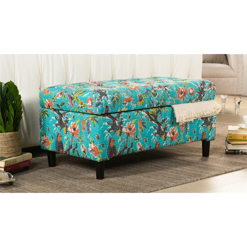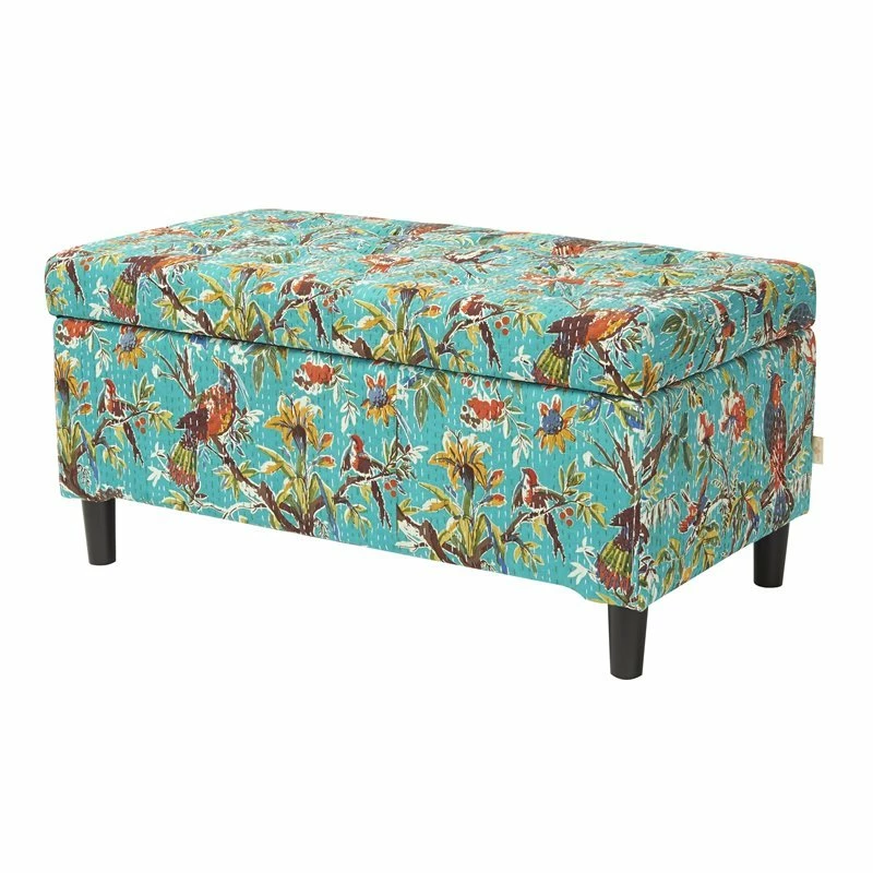 The Maklaine Collection aims to add some functional storage space to the entryway, living area or bedroom. The unique storage bench design features a lifting cover which reveals an ample amount of storage space and organizational options. The selected fabric features a high-quality polyester and viscose blend and engineered for long life. The solid wood frame is made from kiln-dried birch which provides exceptional support and stability. This unique hand tufted kantha design makes this piece simple yet elegant. The Maklaine bench is an ideal choice for the entryway, hallway or living areas. This bench brings class and lounging comfort to any room in the home, whether it’s used as a footrest or additional seating for guests. Our products offer a unique versatility in design and makes use of a variety of trend inspired color palettes and textures to bring new life to the classic American home.