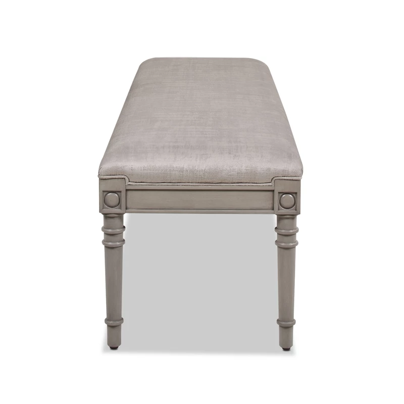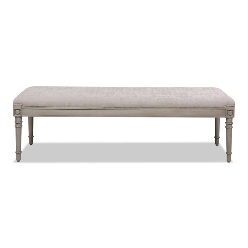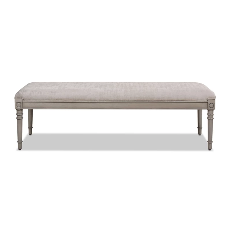 Add class and refinement to any room in your home with the Maklaine 60” Upholstered Bench. Crafted from solid Russian Birch Wood and upholstered in a beautifully antiqued chenille fabric, the Maklaine Bench is the perfect complement to any entryway, dining seating set, or foot of the bed. Artisan wood carved details accent this simple silhouette. See the Maklaine Collection for the matching dining table and chairs, entryway storage console, and more.