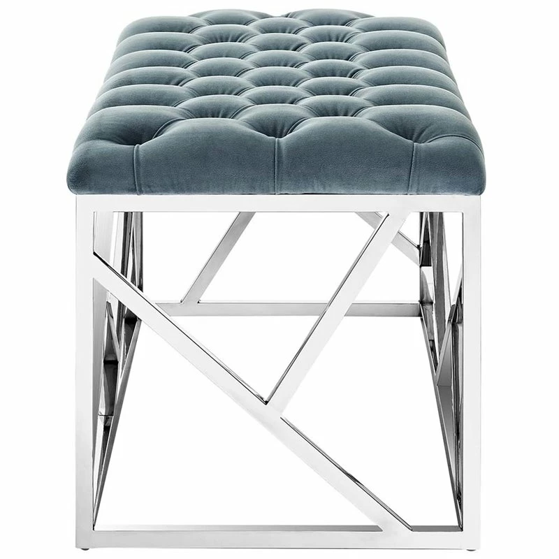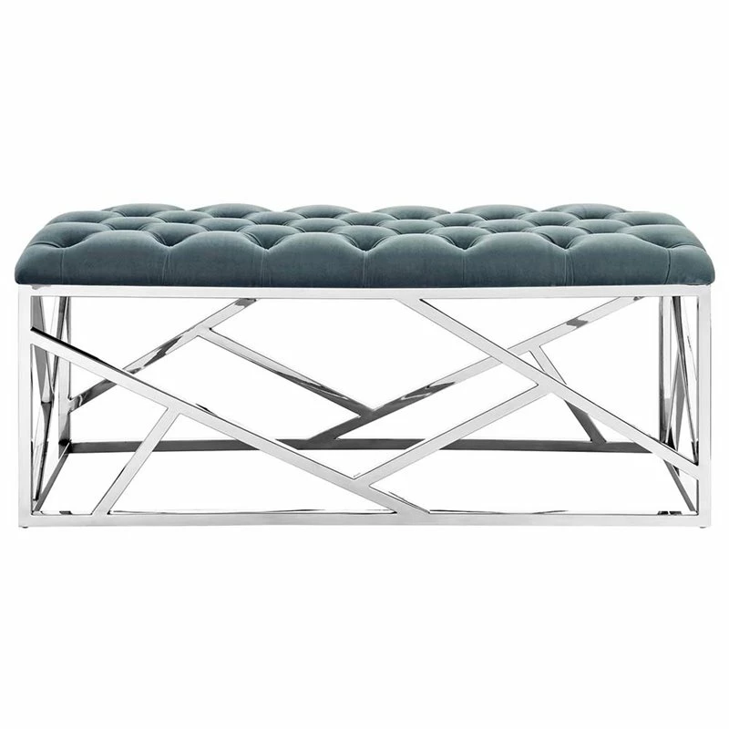Beautify your decor with the Intersperse bench. Boasting a captivating design, Intersperse features a polished stainless steel base, a luxuriously tufted velvet polyester fabric top with elegantly tufted buttons, and non-marking footpads that help protect your flooring. A welcome addition to the modern bedroom or living space, Intersperse combines comfort and style with a supportive seat cushion.