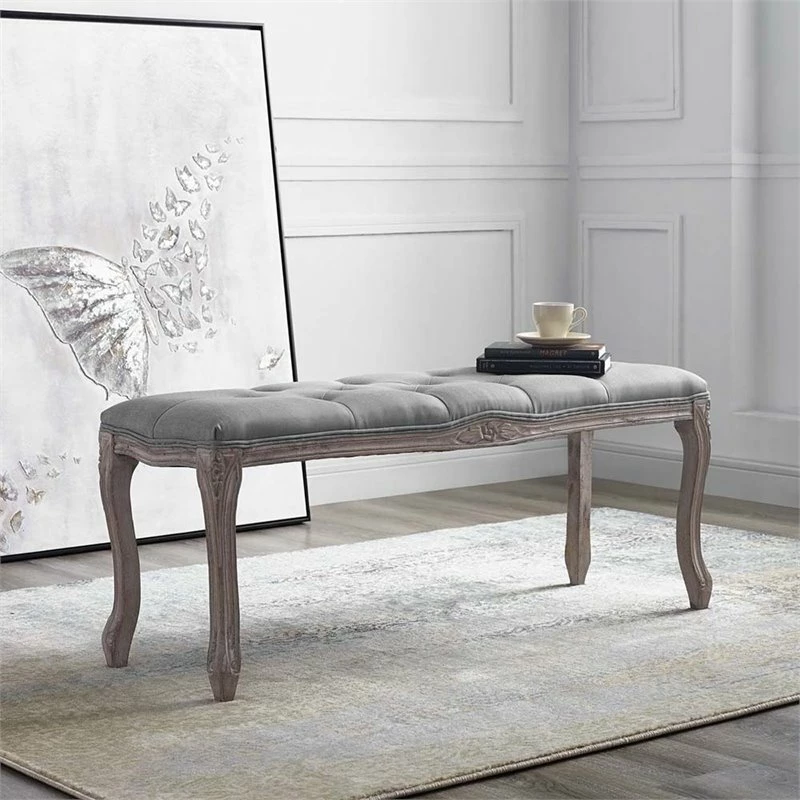 Revel in the whispered opulence of the Regal tufted bench. Featuring a fluted wood frame with elegant cabriole legs, dense foam upholstered fabric seat with welting and button tufting, this bedroom or entryway bench harmoniously blends old world charm with modern intrigue. Designed with a weathered vintage French look and an undeniable appeal. It comes with foot pads to preserve flooring.