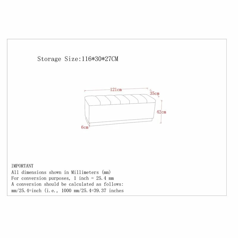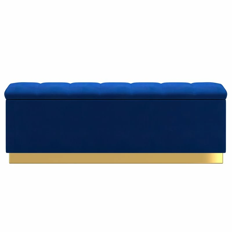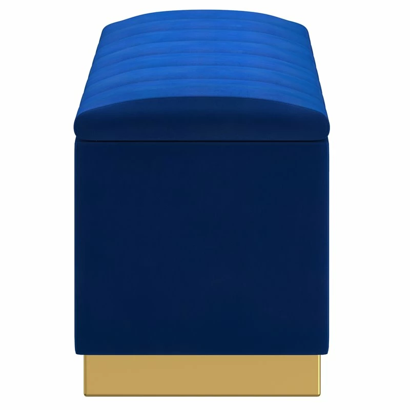 High-end looks and functionality come together in this contemporary storage bench. The hinged top houses a deep storage compartment that is perfect for shoes, blankets, and many other items. Gold faux leather wrapped around the wood base is an unexpected style boost. Finished beautifully with panel stitching detail on the velvet upholstery. In a bedroom, hallway, or by the entrance, this bench will surely make a statement.