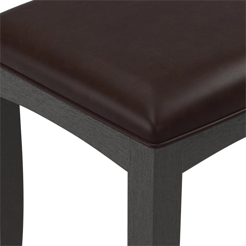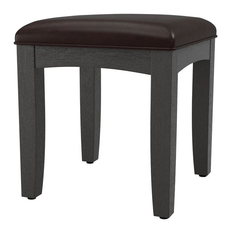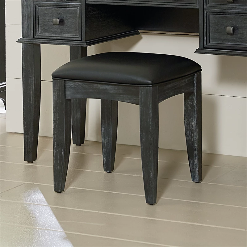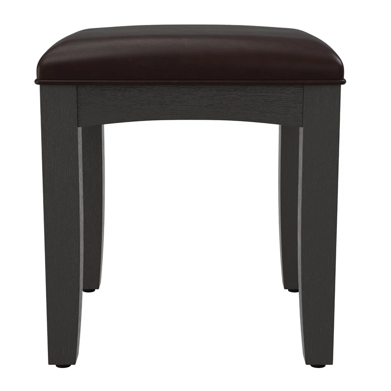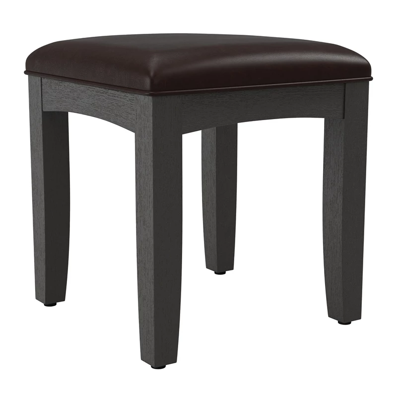 Farmhouse Solid Wood Basics Bench for Vanity in Rustic Black K/D A simple design inspired by the farmhouse look, yet transitional enough to fit any décor. The wire-brushed finish allows the dusty white overcoat to replicate a slightly weathered look into the deep grained wood veneer. Designed by an award winner furniture designer Constructed of Mahogany with Albizia wood veneers with a six-step finishing process applied. The matching vanity bench is made of solid wood and covered with a comfortable cushioned vinyl seat.