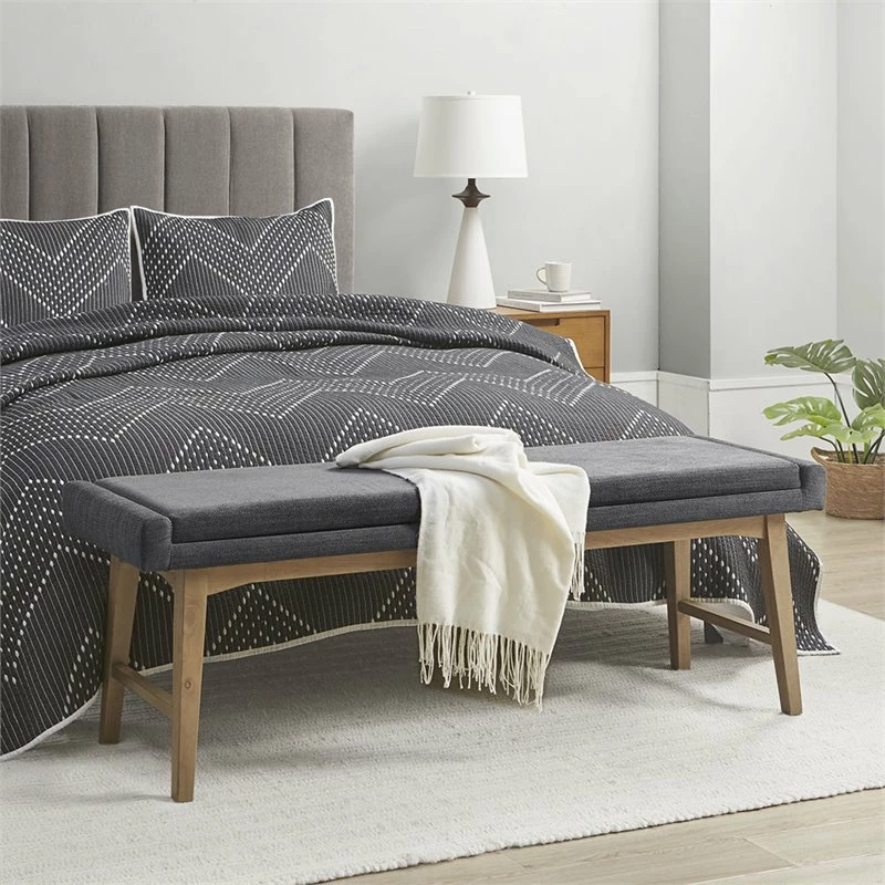 Complete your bedroom or entryway with the simple charm of the INK+IVY April Mid-Century Upholstered Accent Bench. This accent bench features a comfortable foam padded seat upholstered in a multi-hued gray fabric, for a mid-century look. The solid wood base showcases a natural wood finish to complement the upholstery and create a warm aesthetic. With its minimal design, this mid-century accent bench provides a fresh update that easily complements most home decors. Leg assembly is required and tools are included.