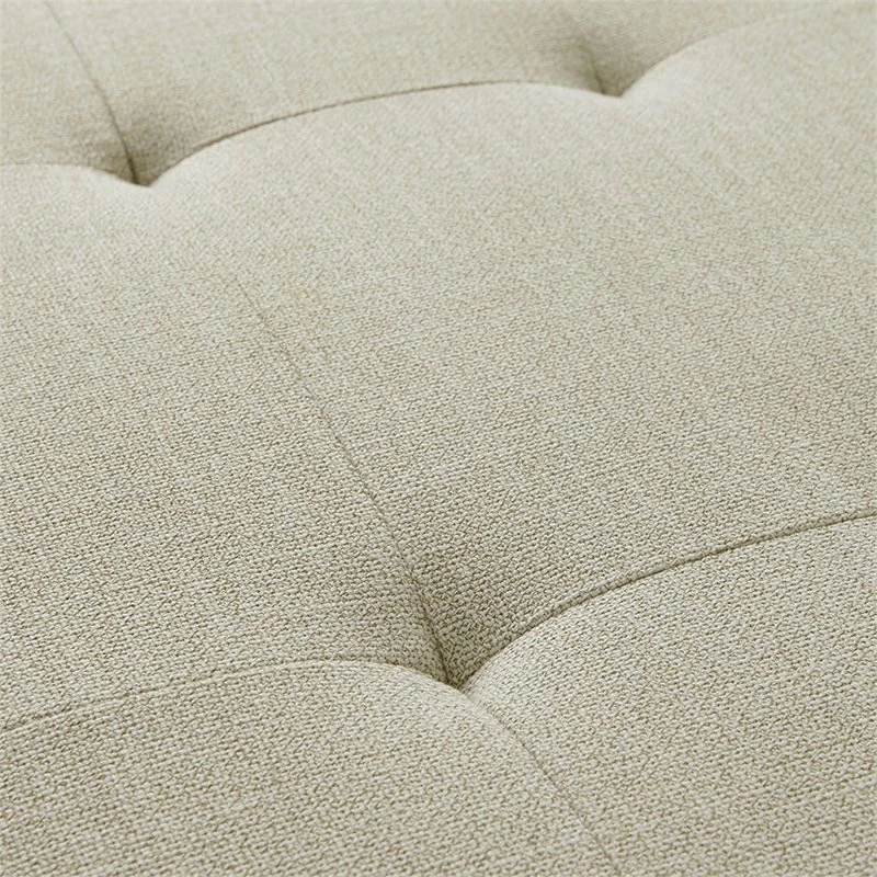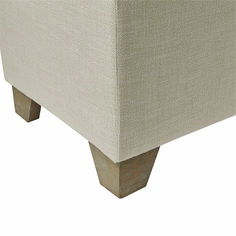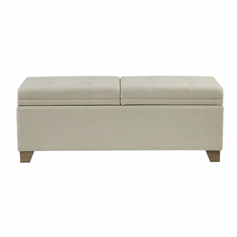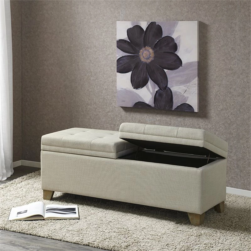 Bring style and functionality to your home with the Madison Park Ashcroft Storage Bench. Upholstered in a natural-hued fabric, this storage bench features a button-tufted top split in half and an ample space for your blankets. The solid wood legs complement the upholstery with a natural finish. Simple and versatile, this upholstered storage bench pairs easily with most home decors. No assembly required.