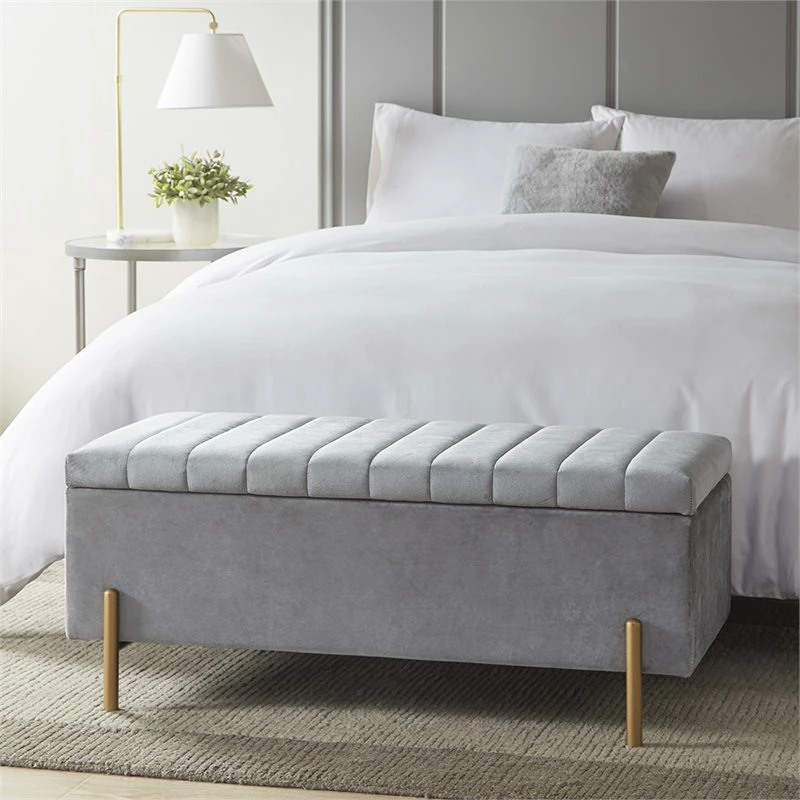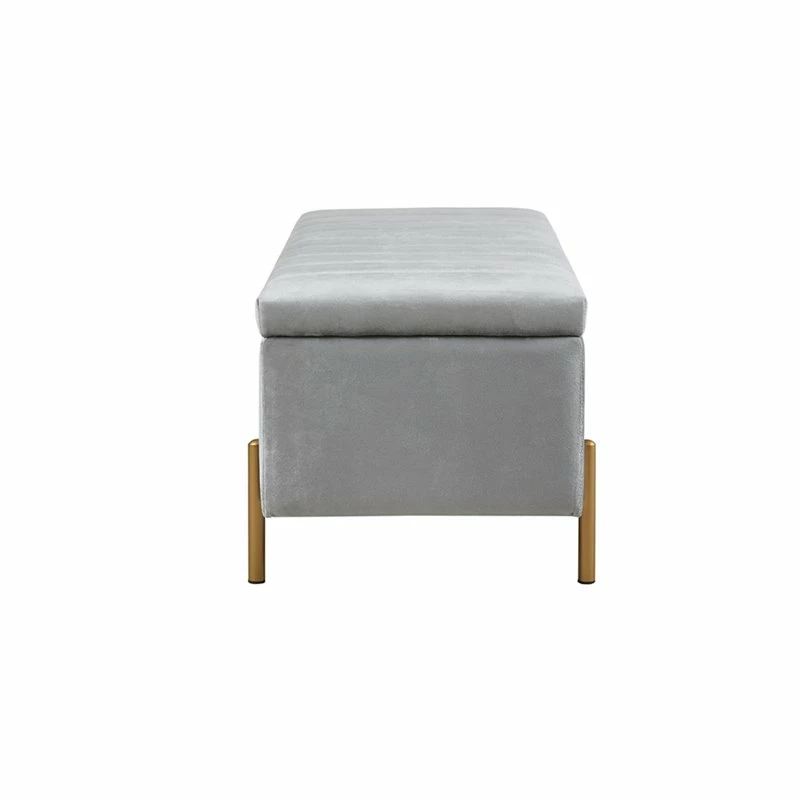 Elegance meets function with the Boyden Upholstered Storage Bench with Gold Metal Legs. Featuring an elegant channel quilting top, this storage bench is upholstered in a lush gray fabric and provides ample storage space for your blankets. The metal legs flaunt a gold finish that adds a luxurious touch to the transitional design, making the storage bench the perfect focal point in your living room. Leg assembly is required and a tool is included.