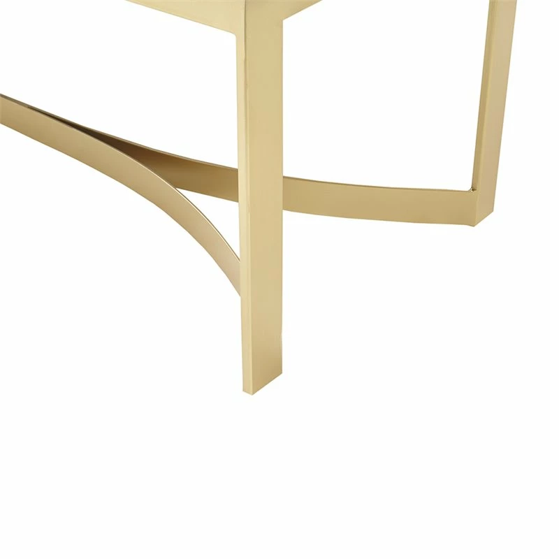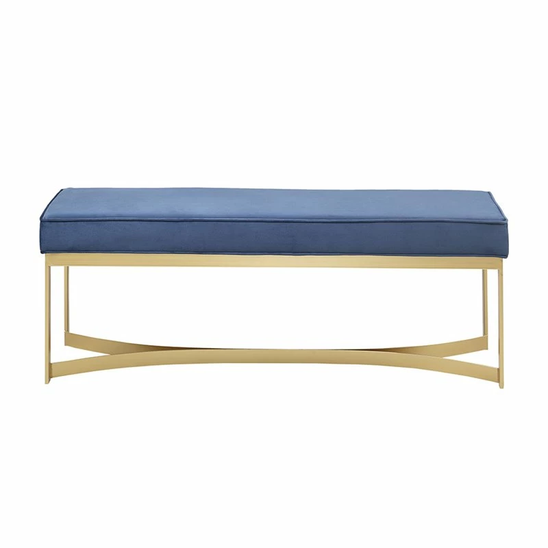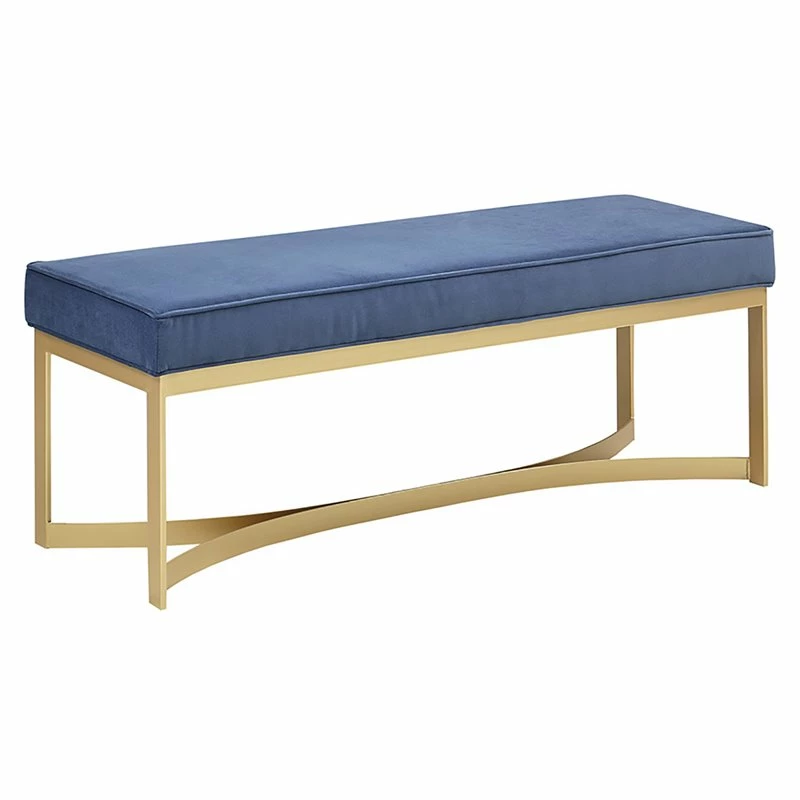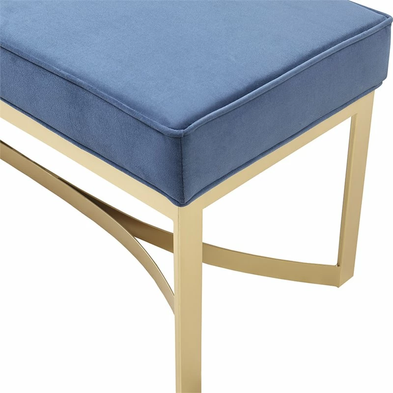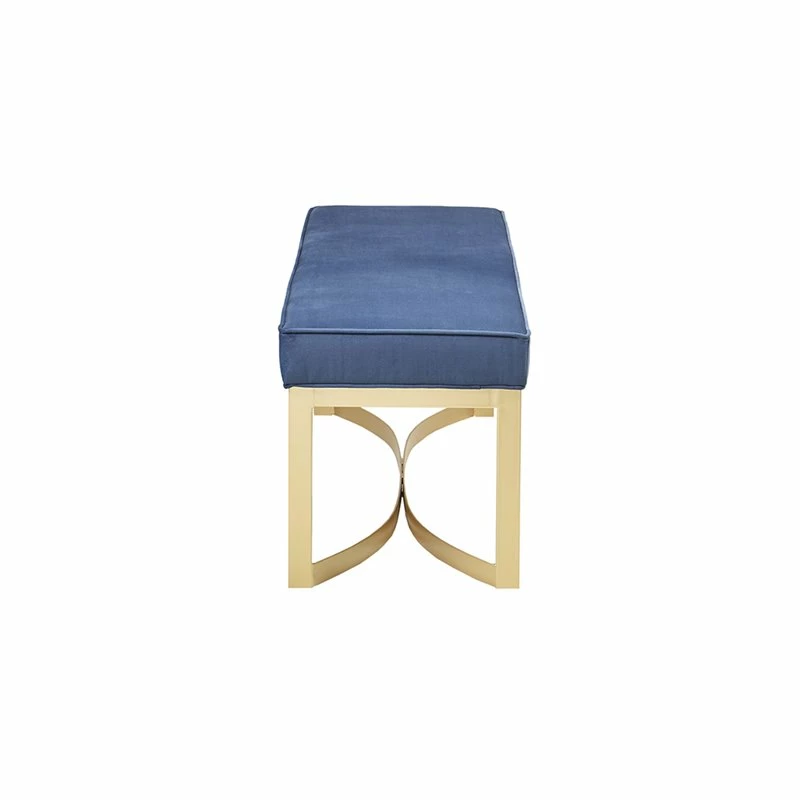 Update your home decor with the sleek style of the martha Stewart secor bench. This accent bench features a blue upholstered seat with a gold metal base that creates a chic modern look. Place this bench in your entryway, bedroom, or living room to give your home decor a contemporary touch. No assembly required.