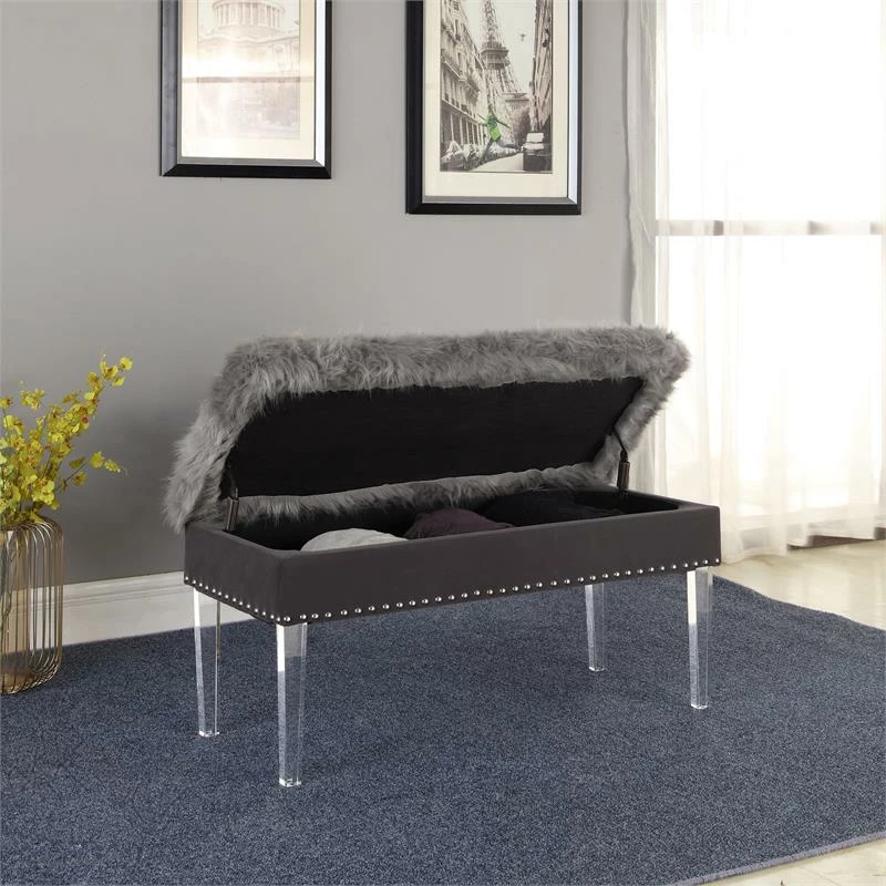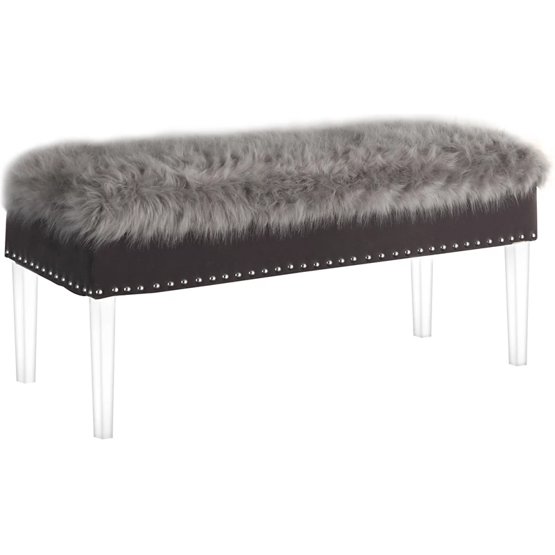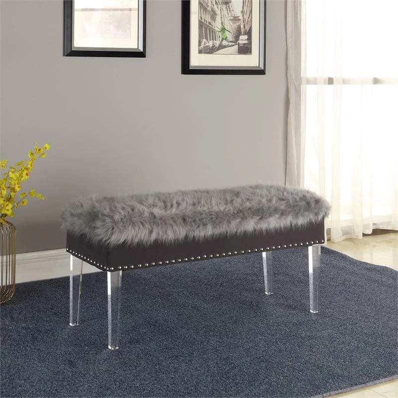Gray Horice Faux Furry Mid-Century Modern Tufted Upholstered Bench brings you a design with all of the style and versatility you could want. This bench includes clear acrylic ghost square tapered legs that is eye-catching and sleek. This bench is perfect for an entryway, bedroom, living room adding a stylish and functional modern accent. The clear acrylic ghost legs offer a dramatic look to the simple shape. Has ample storage organization to place your blankets, pillows, sheets and such. Standing stylishly on gracefully clear acrylic tapered legs, this chic piece features plush seating with tufted details for lasting comfort.
