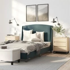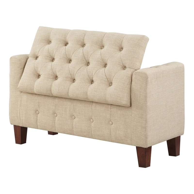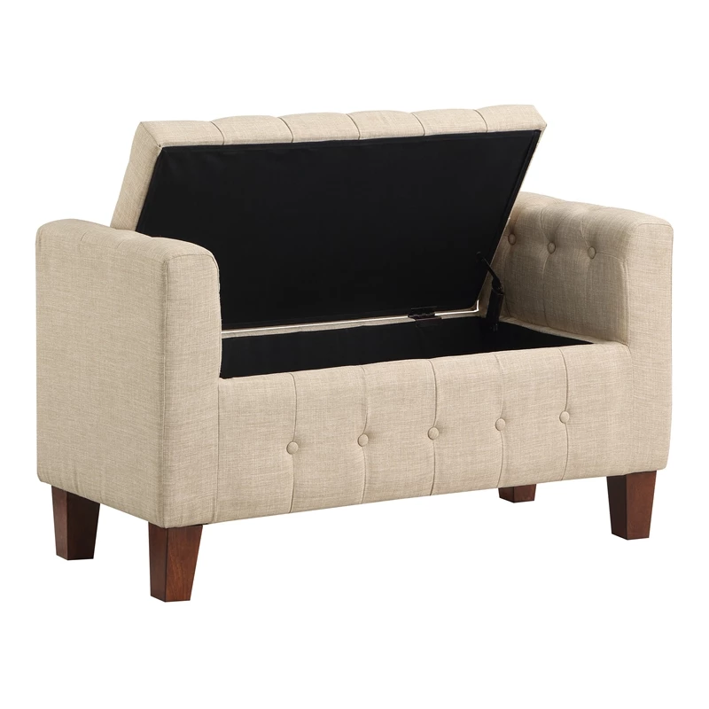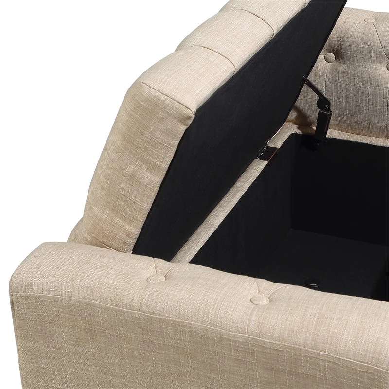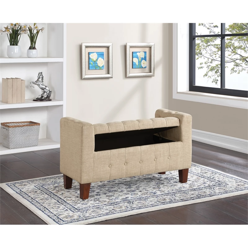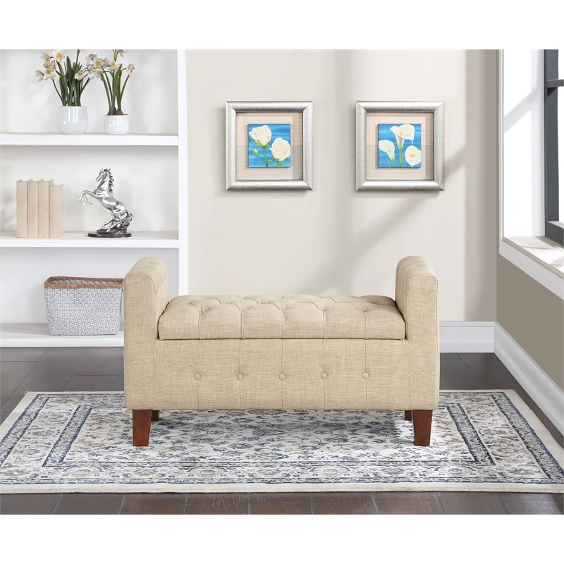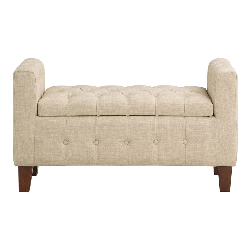 Darnley Storage Bench in Cream Fabric Offer a charming storage solution to any guest room or entry. An ideal place to sit and put on shoes, store pillows and throws or simply create a beautiful finishing touch to your bedroom. A durable soft-close hinge will keep fingers safe and button tufting in 100% Polyester fabric makes this storage bench the beautiful choice. Simple assembly.