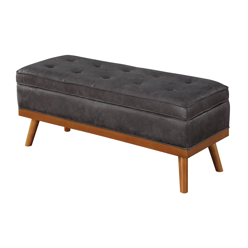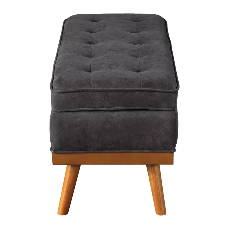 Katheryn Storage Bench in Charcoal Faux Leather Update your entry with a Mid-Century Modern statement piece that doubles as extra home storage. This plush, button tufted storage bench sets the mood as guests enter your home and offer a spot for purses, backpacks, or shoes. Place in front of a sofa for a soft place the kick your feet up while storing all your blanket throws. Modern, tapered, solid wood legs provide stability, while the soft-close hinged top allows for easy access to the fully lined storage space. Complete your home style with the Katheryn storage bench.