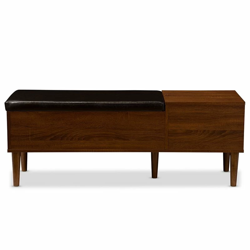 Dual-purposed and versatile, this bench is a great addition to your foyer, mudroom, utility room or bedroom. Featuring retro modern style, this bench is constructed of engineered wood and finished in two-tone finishing, oak and espresso brown. The dark brown faux leather cushion provides a comfortable seating area and ample storage space when it is lifted open. The drawer on the right provides extra storage space for your hats, keys, gloves and scarfs. Silver hardware is in use to add modern tone. Shapely legs featuring mid-century style are constructed of solid rubberwood, supporting the seating storage bench.
