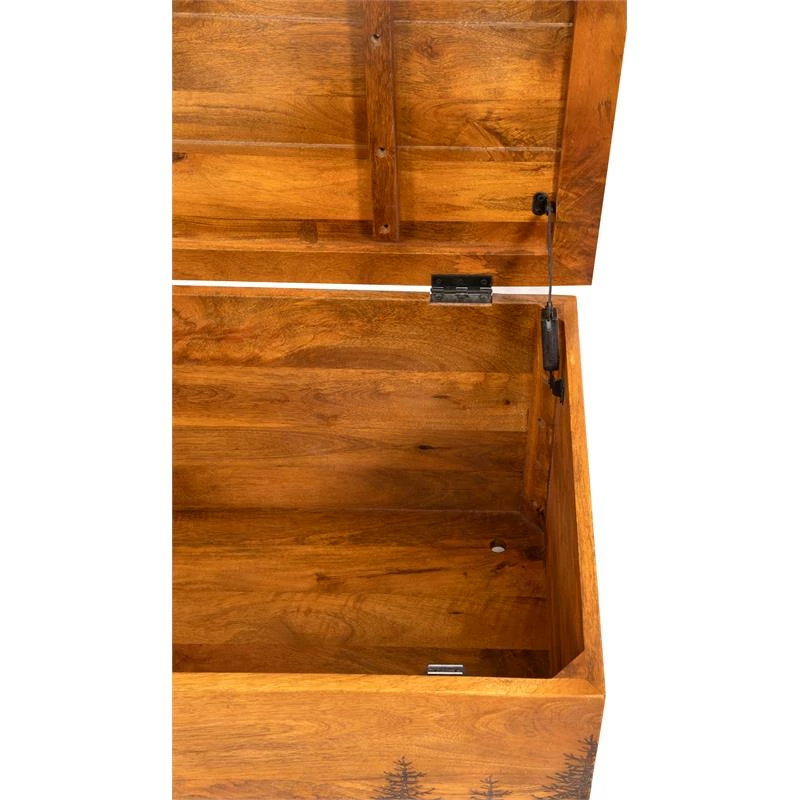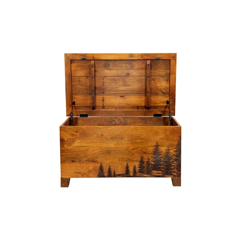 The Cascade solid mango wood trunk features a black laser etched fir trees. This unique burning technique creates a one of kind Northwest piece. With a flip top opening, this unique piece provides plenty of storage.