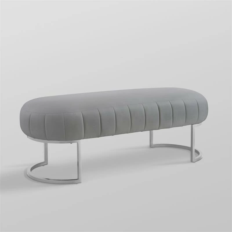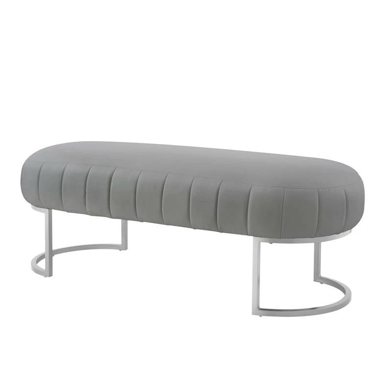 This modern Channel Tufted bench is sure to catch the eye of any visitor. The unique oval shaped seat top is complemented by its matte metal half round leg, which increases its durability, stability, and strength allowing it to last for years to come