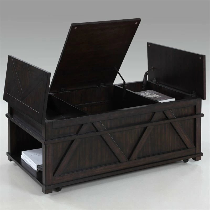 Selected dark finish pine veneers combined with poplar solids. Unique chest style cocktail table features storage everywhere! This storage chest cocktail features 3 lift tops and concealed casters for storage and mobility. Center of top lifts for deep storage area and both ends of the top conceal more storage areas. Sides of the cocktail are open for even more area to store items. Custom metal hardware in an antique bronze finish and decorative diagonal strips of solid poplar provide design and eye appeal.